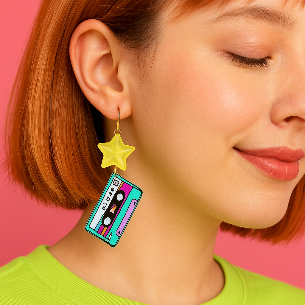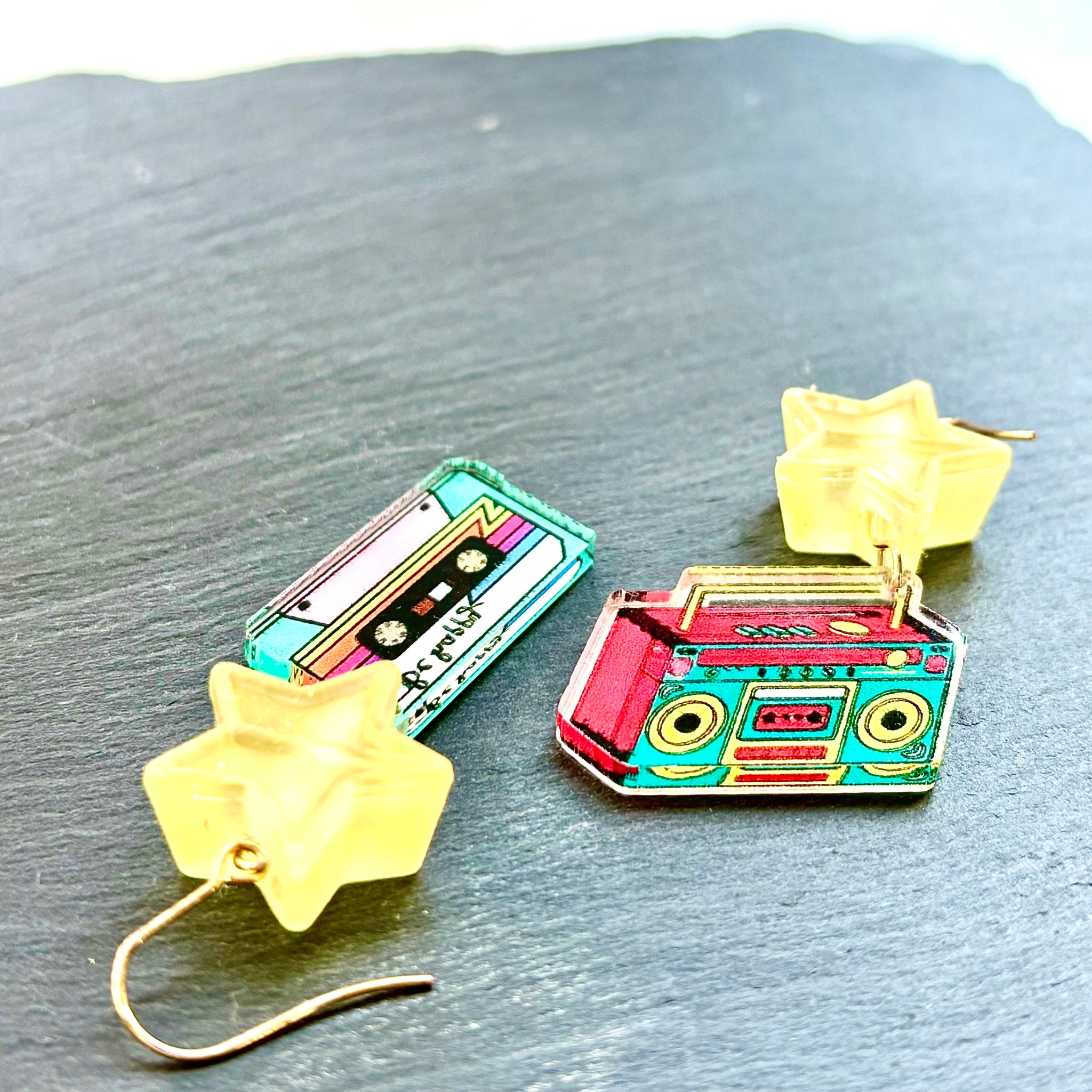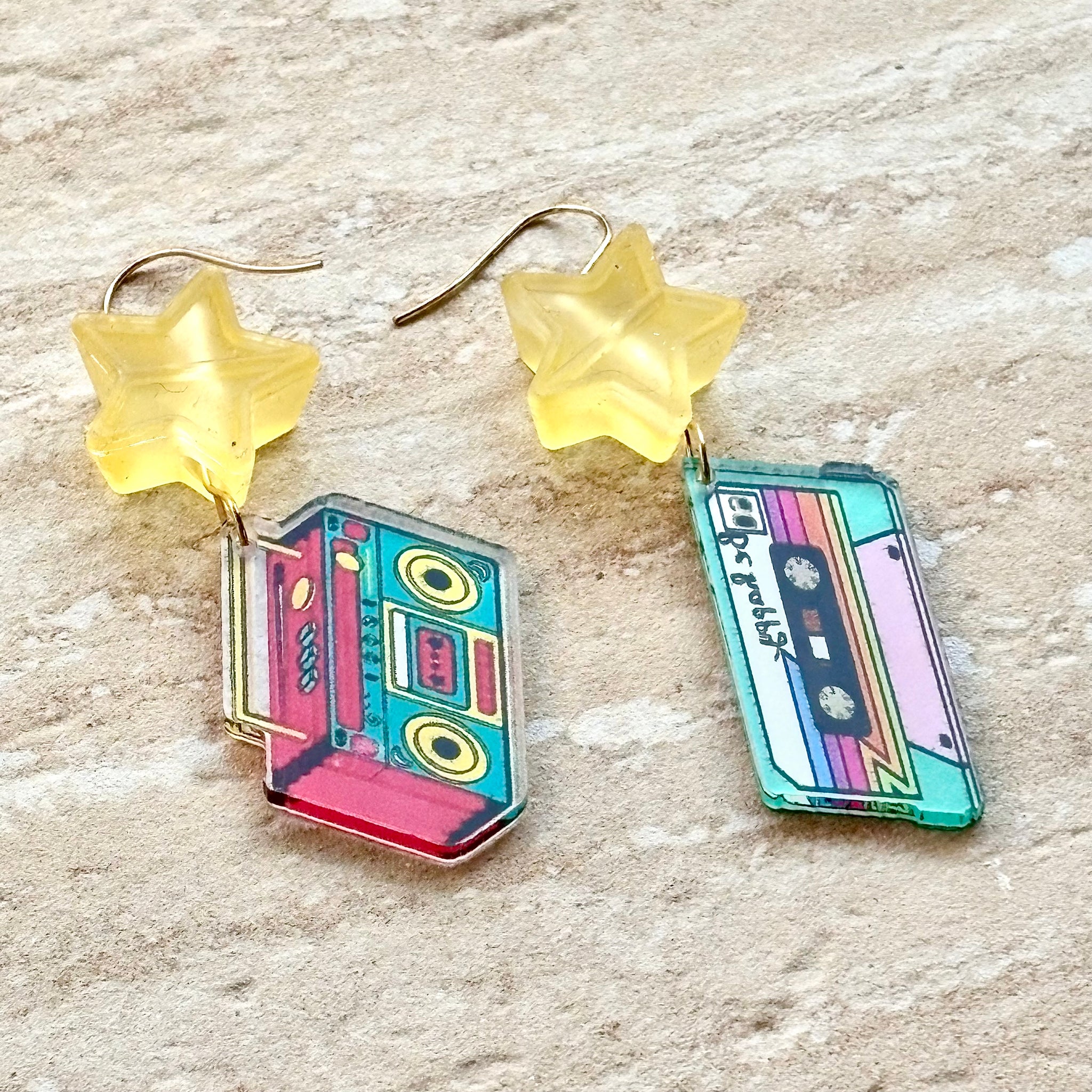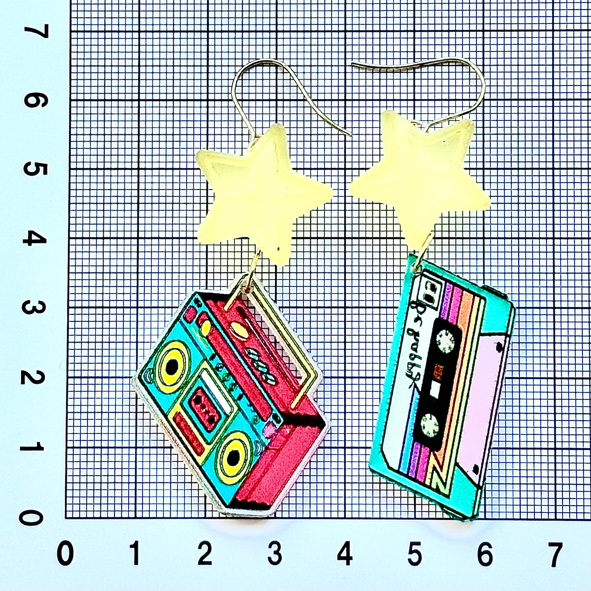 懐かしいラジカセとカセットをモチーフにしたピアスです。